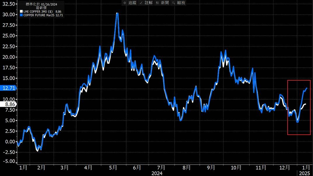 如今「紐約商品交易所Comex」期貨溢價約 623 美元/噸,已高於「倫敦金屬交易所 LME」,其接近2024年震撼全球銅市的歷史性空頭擠壓紀錄,當時是交易員爭先恐後地將 “倫敦期貨銅” 賣往 “美國期貨倉庫”,因而從飆升中赚取套利價差,2025年是否會再次重倒覆轍,端視於川普政策所引導。如今紐約期貨銅的溢價飆升,就是對於川普財經政策的孤注賭盤,也可能視為全球期貨商品的前哨戰布局。