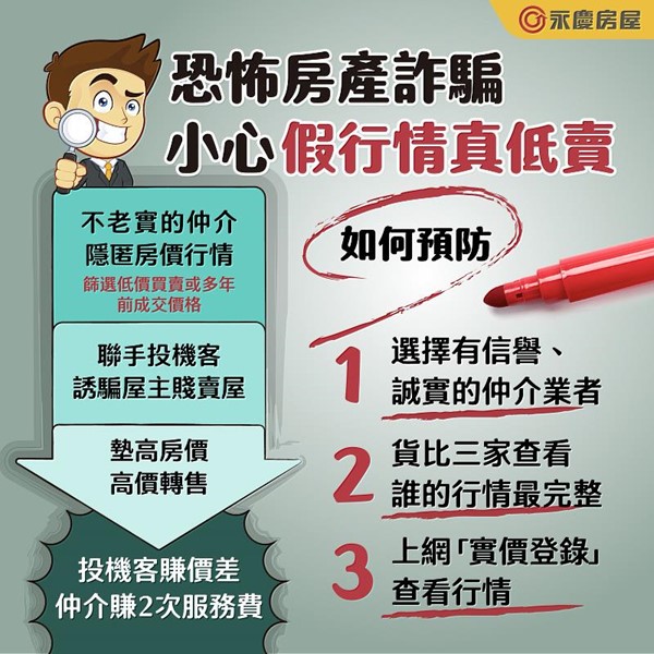 永慶房屋業管部協理陳賜傑提醒,詐騙集團除了假冒屋主、買方在買賣過程中行騙,還可能造假房價行情,讓受害人蒙受巨大財產損失。此類詐騙手法為:不肖仲介聯手投機客,先誘騙屋主以低價賤賣房子,再簡易裝潢、墊高房價轉售。投機客可以賺「低買高賣」的價差,不肖仲介則能賺兩次服務費。即使屋主後來發現房屋被高價轉賣,或是後一手買方發現用不合理高價買到投機客房子,通常已經交屋完成,不容易追討回價差。