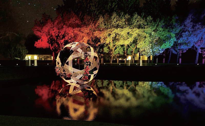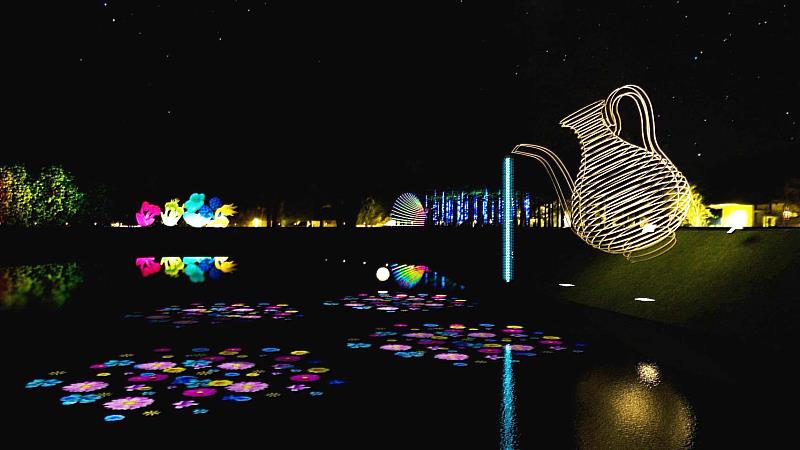 張婉芬處長進一步說,這次活動以大地為畫布、用光影藝術將北香湖公園妝點為城市戶外藝術館,運用光環境色光圍繞北香湖詮釋《桃花源記》的幻境,並設有8處光影藝術展區,其中直徑達7公尺的巨型竹編月亮「逐花月影」,結合傳統竹編藝術及人造花與現代光影科技,是全台絕無僅有的「湖上竹月」,傳達在快節奏的現代生活中,也要珍視並傳承歷久彌新的文化藝術。另使用3萬流明投影設備打造長寬30×15公尺巨型投影,搭配活動專屬3分鐘動畫的樹上光影劇場「夢月流光」、色彩絢麗的巨型花形氣模雕塑,如同跳脫現實進入夢想的「烏托邦」、以《李白•月下獨酌》為靈感,透過茶壺倒酒的意境,水面映出美麗花朵的「壺光對影」等必訪展區,將帶領遊客感受桃花源般如詩如畫的美好。