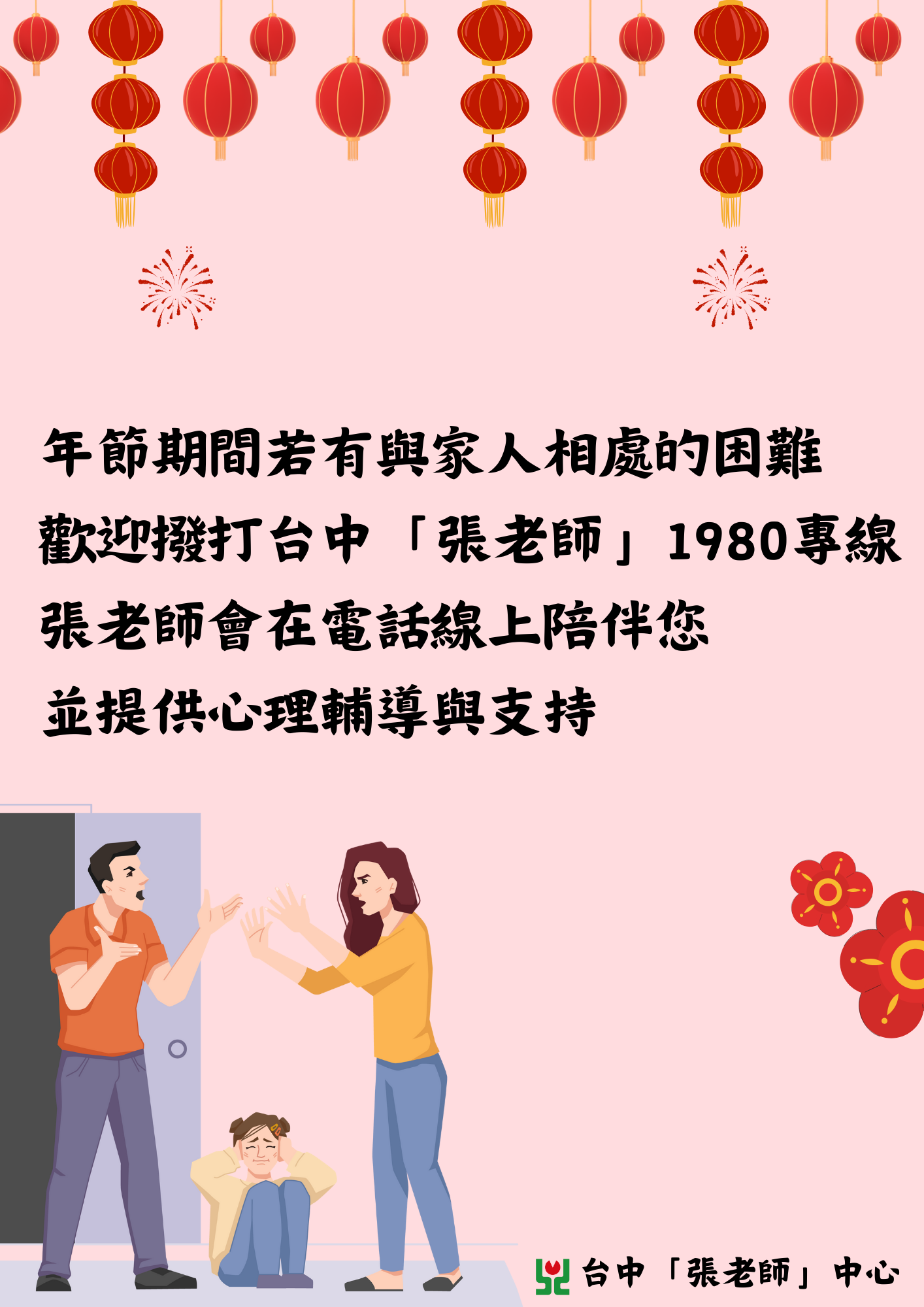 過年長假應是共享溫暖與歡樂的時光,但長時間的相處可能使家人間的矛盾浮現。透過尊重彼此、適當溝通、留出個人空間,以及培養感恩與包容的態度,可以有效減少衝突,增進家庭和諧。若還是有與家人相處的困難,歡迎撥打台中「張老師」1980專線,張老師會在電話線上陪伴您,並提供心理輔導與支持。