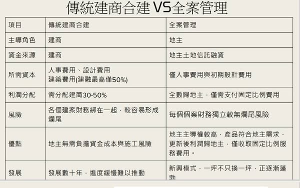 創新的作為 [ 全案管理 ] 因為合建的比例造成建商和地主雙方信任問題,造成都市更新長久延宕,造成都市更新最大隱憂。近期可以解決都市更新合建問題就是進階版[全案管理],就以傳統委建方式提升一級,由建設公司做為代理實施者,將所有分回建坪售出部分給付營建成本,由建設公司一條龍服務以整合及專業團隊如:建築師、估價師、建經公司、營造公司、代銷公司等一條龍服務。