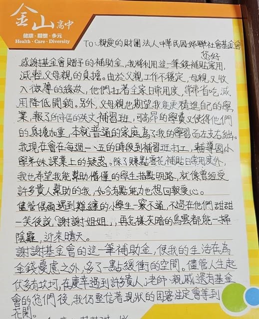 溫馨感人的愛心公益活動,深深融化現場每一位出席者。來自於「金山高中」的蔡同學,持以一封親筆信函表達謝意,來自於「雙溪高中」的林同學與蔡同學,在老師的陪伴下,親自表達了最真誠的感謝之意。微薄的獎助學金,期待能發揮雪中送炭的功能,並再次喚起國家、社會對於弱勢家庭學童的教育關懷。