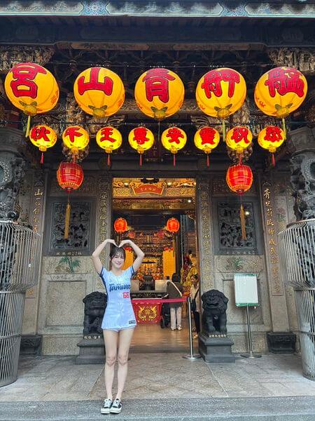 「零死角女神」林岱縈,日前到萬華艋舺青山宮當志工發放祭品的時候,在廟方工作人員導覽下,發現有一尊神明也跟「台灣隊長」陳傑憲在賽中轟出三分砲,跑壘時在胸前比出「Team Taiwan」的冠軍手勢,廟方則是跟她說,神尊手勢意思是「日月轉乾坤」。林岱縈說,我站在這尊神像前停留了很久,一開始也是沒發現,在了解神明的典故時,也是廟方的人跟我說,神明也有比「冠軍手勢」。仔細觀察神明胸前比框的動作,比出了一個框框手勢,跟陳傑憲比出的手勢一樣,真的是太神奇了。