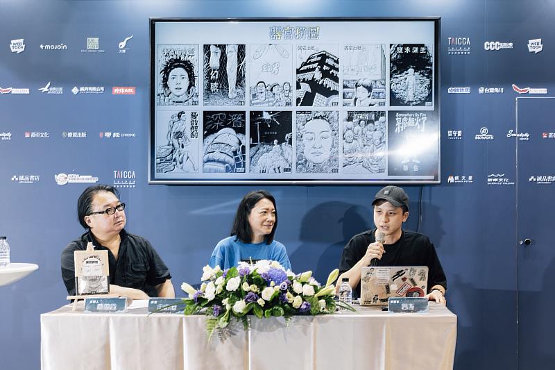 先於「 CCC 追漫台」連載,近期由鯨嶼文化出版的《器官拼圖》,特別邀請漫畫家藥島與藝術家曲家瑞進行新書座談。《器官拼圖》為藥島的首部商業漫畫,以九篇極短篇故事建構出一部科幻驚悚作品。鯨嶼文化總編輯湯皓全表示,當初在社群媒體上就被藥島的獨特畫風所吸引,此書六月出版,現在已邁向三刷,很開心在主流市場外有這樣的好成績。藥島分享了自己的創作受到作家史蒂芬·金和漫畫巨匠墨必斯的影響,在實踐大學時由曲家瑞老師帶領的設計繪畫課也對他影響至深,開啟了他對人體和線條的想像。他也提到,從過去自行印製作品到攤位販賣,後來投稿《 CCC 創作集》,並在「 CCC 追漫台」連載和獲得出版機會,非常感謝各方支持,也感謝在文化部的補助下即將前往西班牙駐村,繼續創作。身為藥島的大學導師,同時也是粉絲的曲家瑞,笑讚藥島「優秀得令人火大」!她分享了藥島對於氣氛掌握、人物刻畫與肢體情緒的卓越表現,也用心準備《器官拼圖》的閱讀心得,與藥島熱情交流。